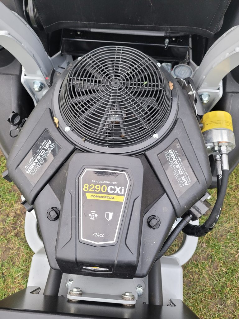 Voor de aandrijving zorgt een tweecilinder 22 pk Briggs & Strattonmotor met 724 cc inhoud. Zoals bij een zeroturnmaaier geregeld het geval is, zijn ook hier de brandstoftanks links en rechts op de machine gemonteerd en houden ze in totaal 30 liter bij wat overeenkomt met een volle werkdag maaiplezier.