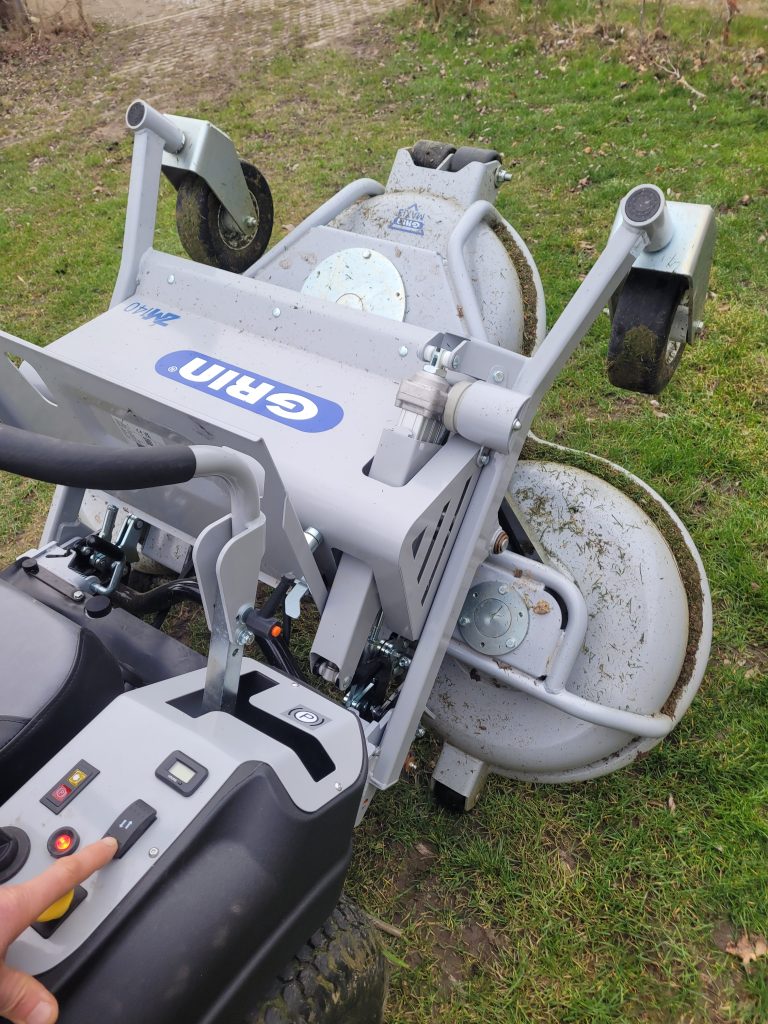 Grin biedt de ZM aan met een maaidek van 120 en een van 140 cm. We hadden de versie van 1m40 met drie messen dat in de praktijk 1m46 meeneemt. Ook op deze maaier gebruikt Grin zijn eigen gepatenteerd maaisysteem waarbij het gemaaide gras volledig wordt vermalen. De drie maaidekken werken onafhankelijk van elkaar waardoor de luchtstroom van de ene de andere niet beïnvloedt en het vermogen dus maximaal aangewend wordt. De dekken zitten met een overlap van meer dan 16% tegenover elkaar waardoor er zelfs kort kan worden afgedraaid zonder dat er strepen ongemaaid gras blijven staan. Het maaidek is scharnierend opgehangen en kan zowel horizontaal als verticaal pendelen waardoor het vlot alle vormen van het terrein kan volgen. Voor het onderhoud aan het maaidek kan dit elektrisch tot ongeveer 45° opgeklapt worden.